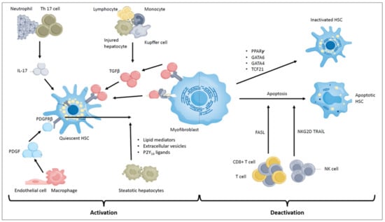 The reversal of HSC activation was documented in rodent models of fibrosis resolution [1,2,4,5]. During fibrosis regression, activated HSCs are eliminated either via apoptosis or by reverting to a quiescent HSC phenotype, where they remain in a primed state and respond more rapidly to new fibrogenic stimuli [2,4,5]. Studies in transgenic mice have revealed that activated HSCs can revert to a quiescent state after eliminating the etiological factor of liver fibrosis [192,195]. Kisseleva et al. investigated HSC deactivation using transgenic mice with CCl4- or ethanol-induced liver fibrosis [184]. After long-term complete recovery, fluorescent quiescent HSCs have been observed in the liver [184]. Troger et al. studied the activation and deactivation of HSCs in a BAC-transgenic mouse using two complementary approaches, i.e., scPCR and genetic cell fate tracking [193]. They thus demonstrated that HSC activation markers, such as expression of the Col1a1 and TIMP1 genes, gradually and continuously decreased in almost all of the activated HSCs during the recovery period after CCl4 and thioacetamide treatment [193]. The authors suggested that HSCs are deactivated in the healing liver [193]. Similar findings have been recorded in transgenic mice l, in which 40% of HSCs reverted to a quiescent phenotype in the recovering liver [192]. Importantly, during the resolution of liver fibrosis, the location of HSCs shifts from the fibrotic septa to a perisinusoidal site [193]. The activation of liver-resident NK cells can contribute to the resolution of liver fibrosis by killing activated HSCs [193]. Additionally, NK and NKT cells are a major source of IFNγ that has a potent antifibrogenic effect and promotes HSC apoptosis [195]. Hepatic NKT cells can exhibit a dual, either protective or pathogenic, role in liver diseases. In the setting of liver injury in mice, hepatic CXCR6+ NKT cells promote the release of inflammatory cytokines such as IFNγ and IL-4 that drive liver fibrosis [195,203]. The upregulation of the antiapoptotic genes HSPA1A or HSPA1B affects the survival of inactivated HSCs [184]. Blocking TLR4 signaling in mice or reducing hepatic exposure to intestinal microorganisms improves liver fibrosis [81].