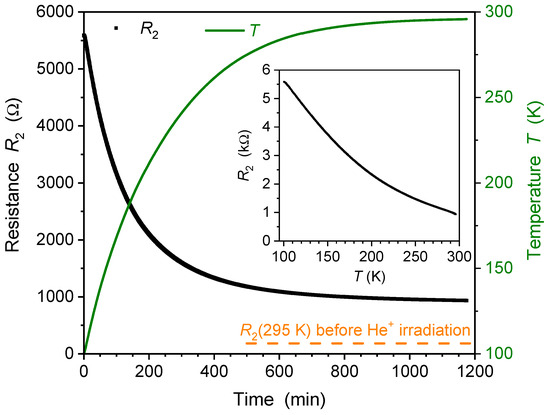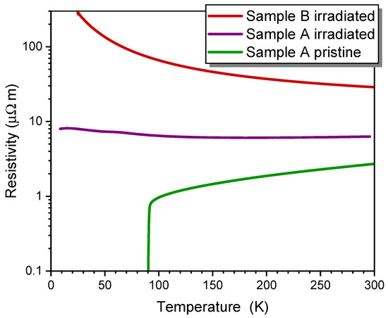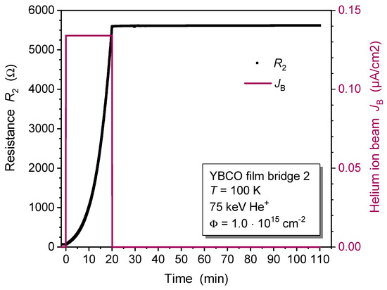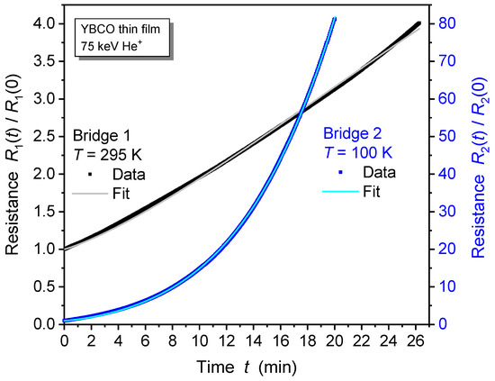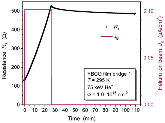 - Markowitsch, W.; Steiger, B.; Lang, W.; Bodea, M.A.; Pedarnig, J.D. Optically induced changes and long-term relaxations of resistivity and critical temperature in He+ irradiated YBa2Cu3Ox. Thin Solid Film. 2010, 518, 7070. [Google Scholar] [CrossRef]