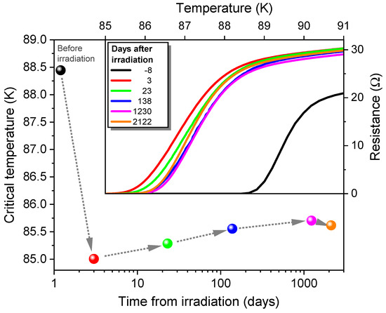 - Barbour, J.C.; Venturini, E.L.; Ginley, D.S.; Kwak, J.F. Irradiation Effects in High-Temperature Superconductors. Nucl. Instr. Meth. Phys. Res. Sect. B 1992, 65, 531. [Google Scholar] [CrossRef]