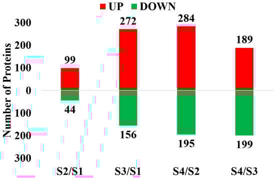 In the four contrasts, 3775 proteins were obtained through iTRAQ with a confidence level of 95%. Among them, 3540 proteins were successfully labeled. In S2/S1, 143 DEPs that consisted of 99 up-regulated proteins (S2/S1 ratio > 1.5, p value < 0.01) and 44 down-regulated proteins (S2/S1 ratio < 0.67, p value < 0.01) were identified (Figure 1). In S3/S1, 428 DEPs that consisted of 272 up-regulated proteins (S3:S1 ratio > 1.5, p value < 0.01) and 156 down-regulated proteins (S3/S1 ratio < 0.67, p value < 0.01) were identified. In S4/S2, 479 DEPs that consisted of 284 up-regulated proteins (S4/S2 ratio > 1.5, p value < 0.01) and 195 down-regulated proteins (S4/S2 ratio < 0.67, p value < 0.01) were identified. In S4/S3, 388 DEPs that consisted of 189 up-regulated proteins (S4/S2 ratio > 1.5, p value < 0.01) and 199 down-regulated proteins (S4/S2 ratio < 0.67, p value < 0.01) were identified. In these sets, the up-regulated DEPs were more abundant than the down-regulated DEPs. The distribution of DEPs is shown in a Venn diagram (Figure 2). After duplicates were removed, 885 unique DEPs were obtained, and 12 proteins were differentially expressed in all of the examined contrasts (Figure 2, Table 1).