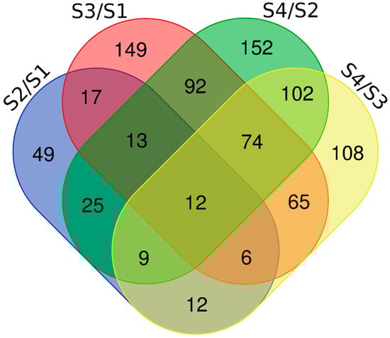 The distribution of DEPs in S2/S1, S3/S2, S4/S2, and S4/S3. A Venn diagram illustrating the specific and common proteins between the different contrasts.