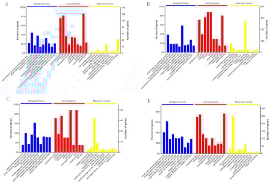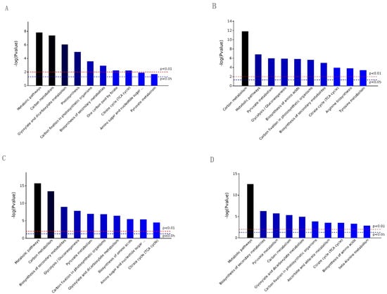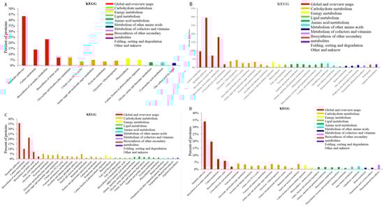 The KEGG classification of the identified DEPs. p values below the 0.05 threshold. (A), S2/S1; (B), S3/S1; (C), S4/S2; (D), S4/S3. Note: The full names with ellipses in (A,C) are both Amino sugar and nucleotide sugar metabolism.