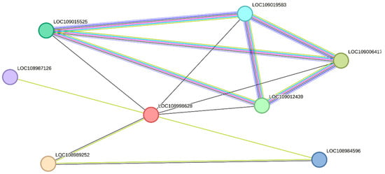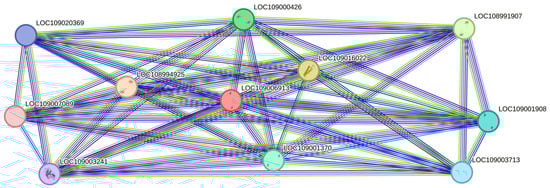 Through a string network analysis in the Juglans regia database, the DEPs of XP_018841899.1 (LOC109006913) were discovered to interact with another 10 proteins (Figure 6). The protein of XP_018841899.1 was predicted to be a chlorophyll a-b binding protein of LUCI type 1-like involved in photosynthesis. Among the proteins that interacted with it, five proteins (LOC108991907, LOC109001908, LOC109003241, LOC109001370, LOC108994925) had similar functions, while the remaining three proteins (LOC109016022, LOC109003713, LOC109020369) functioned in the photosystem I reaction center. The protein of XP_018832838.1 (LOC109000426) was up-regulated in S2/S1. From Figure 7, it can be seen that the protein of XP_018830780.1 is the unique protein in S3/S1 that is related to stamen-specific expression. The four proteins (LOC109015525, LOC109019583, LOC109006417, LOC109012439) that interact with it are involved in nitrogen metabolism and energy metabolism. One protein (LOC108984596) has the function of an aquaporin.