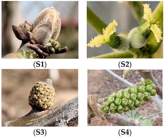 The plant materials were collected from the National Horticultural Germplasm Resources Center’s walnut variety nursery in Zhengzhou, China (E113°22′14.8″, N34°579.78″) from February to March. The walnut variety named ‘Zhuxing’ was protogynous, 8 years old, and grew well. The samples were used in the period before and after the opening of the female and male flower buds, which were collected in four states, namely, unopened pistils (the stigma is closed and the pollen cannot be accepted), opened pistils (the stigma is open and pollen can be accepted), unopened stamens (the spikes are less than 30 mm long and unpowdered), and opened stamens (the spikes are longer than 100 mm long and are already powdered), labeled S1, S2, S3, and S4, respectively (Figure 8). All inflorescence samples were immediately frozen in liquid nitrogen and stored at −80 °C until use. Ten biological replicates were mixed and then divided into the three prepared experimental replicates.