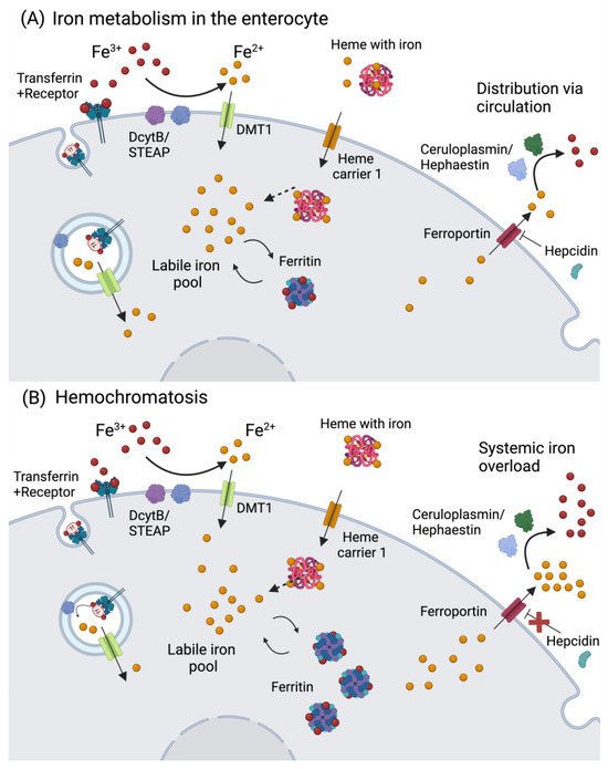 Iron enters the body via dietary sources in two major forms: heme and nonheme iron. The bioavailability of heme-Fe2+ from meat, fish, and poultry is around 20–40%, while non-heme-Fe3+ present in vegetables, fruits, and cereals has a lower bioavailability of ca. 15% [32]. Iron absorption can be hindered by other metals (calcium and zinc), phytates, polyphenols, and proteins such as conglycinin, present in soybeans [1,33], but is augmented by vitamin C, which enhances the absorption of the nonheme form. Besides its ability to reduce Fe3+ for cellular uptake, thereby increasing its bioavailability, vitamin C also stimulates ferritin synthesis and the transferrin (Tf)-dependent Fe3+ uptake [34]. Otherwise, Fe3+ reduction is mostly performed by ferrireductase duodenal cytochrome b (DCYTB)/six transmembrane epithelial antigen of the prostate (STEAP), allowing Fe2+ uptake via the divalent metal transporter 1 (DMT1), while heme-Fe2+ is transported by the heme carrier protein 1 (HCP1) into enterocytes (Figure 1A).
