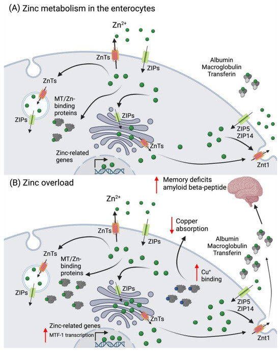 Since there is no body compartment dedicated to Zn2+ storage, the metal needs to be constantly replenished from food, thus the balance between absorption and excretion is tightly controlled. Zinc loss occurs mainly via fecal and urinary excretion, menstrual flow in women, and semen in men, as well as loss through hair and nails, and skin desquamation [1,60,61]. Zinc homeostasis is maintained between Zn transporters (ZnT-) and the Zrt-, Irt-like protein family (ZIP), as well as metallothioneins (MTs), whose expression is induced by Zn+2 via the metal regulatory transcription factor 1 (MTF-1). At the enterocyte level, ZIP4 transports Zn2+ from the intestinal lumen, either to bind cytosolic MT for storage, or to be further transported to vesicles and ER by ZnTs. At the basolateral side, ZnT-1 exports Zn2+ into the bloodstream, while ZIP5/ZIP14 may import Zn2+ back into the cytosol (Figure 2) [62]. Zinc is a co-factor for over 300 proteins, participating in a multitude of physiological processes in the cell. It is involved in signal transduction for endocrine regulation, systemic growth, response to infection and inflammation, and cytokine production, as well as for gene regulation responsible for synaptic plasticity and neuronal death, mood, and memory regulation [62,63].