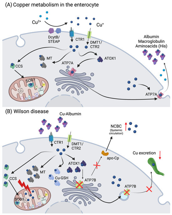 For distribution throughout the body, Cu+ is first delivered via ATPase copper transporting alpha (ATP7A) from the enterocytes to the portal vein, where it binds to serum proteins, such as macroglobulin and albumin, or amino acids like histidine (His) (Figure 3A). Afterwards, Cu+ enters the liver via CTR1 [89]. Intracellular Cu+ binding and transfer amongst Cu-dependent proteins is regulated based on a gradient of increasing Cu-binding affinity [90]. Such “Cu-chaperones” bind Cu+ and transport them either to cytosolic enzymes or transporters that deliver Cu+ to different enzymes in the cellular organelles [90]. For instance, antioxidant protein 1 (ATOX1) is responsible for the transport of Cu+ to ATP7A and ATPase copper-transporting beta (ATP7B) in the trans-Golgi network (TGN). There, apo-Cp can bind up to six Cu+ atoms, turning into holo-Cp, that is responsible for the Cu+ distribution to other tissues [91,92]. Ceruloplasmin is considered a main copper distributor to other organs in the body, together with serum albumin, α-2-macroglobulin, and His-containing proteins (Figure 3) [93]. Also, ATOX1 is responsible for transferring Cu+ to the nucleus or to secretory pathways via ATP7B. The copper chaperone for SOD1 (CCS) distributes Cu+ to SOD1 in the cytosol and mitochondria, while a myriad of other different proteins (Cox17, Cox11, Sco1, and Sco2) are responsible for Cu+ delivery to CCO into mitochondria (Figure 3).