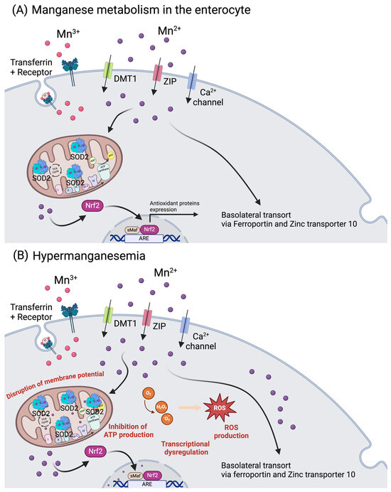 The recommended oral intake of manganese (Mn) for adult men is 2.3 mg/day, and for adult women is 1.8 mg/day. The upper tolerable intake in adults is 11 mg/day, with toxicity being observed above 40 mg/day. Manganese can enter the body via absorption in the GIT tract (3% to 5% of ingested Mn3+/2+ is further taken up, depending on the individual status), through the lungs after exposure to Mn-rich environments, as happens near smelters, or after dermal contact. Manganese also has the particularity of having 11 known oxidative states, ranging from −3 to +7, with Mn3+/2+ as the most physiologically relevant states [117]. In the gut, Mn2+ is transported via DMT1, ZIPs (most prominently ZIP8 and ZIP14), and calcium channels. Manganese can also be absorbed as Mn+3, bound to Tf, via the transferrin receptor (Figure 4) [118].