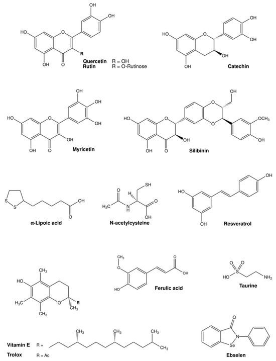 Iron is a redox-active essential transition metal that is indispensable for several biological processes, but can also induce oxidative stress when in excess [176]. Rhee et al. showed that the DMT1 inhibitor and antioxidant ebselen (Figure 6) prevented intracellular Fe2+ uptake and decreased ROS production in human induced pluripotent stem cell-derived cardiomyocytes (iPSC-CMs) subjected to Fe3+/2+ overload. In humans, iron overload induced arrhythmia and contractile dysfunction, similarly to the effects observed in the cardiomyocytes [177]. Natural flavonoids like quercetin (and some derivates), catechin, and rutin (Figure 6) had a positive antioxidant effect on iron excess in human red blood cells. In this study by Cherrak et al., Fe3+ and Zn2+ had an enormous prooxidant effect (37% and 33% induced hemolysis, respectively), while treatment with the flavonoids had a pronounced antioxidant activity against iron, as measured by levels of hemolysate-reduced GSH and MDA, as well as CAT activity [178]. Flavonoids have been repeatedly shown to protect against Fe toxicity, either by direct metal chelation or by scavenging of oxidant species [179,180]. In pre-clinical models, depending on the compound, different effects were described. Wang and co-workers observed that treatment with myricetin reduced iron content and inhibited transferrin receptor 1 (TfR1) in human neuroblastoma cells, and significantly reversed scopolamine-induced cognitive deficits in a mouse model of Alzheimer’s disease [180]. In two different studies, myricetin (Figure 6), present in tomatoes, oranges, nuts, berries, tea and red wine, significantly inhibited hepcidin expression in vitro and in vivo [181], thereby possibly preventing iron accumulation in the brain [182]. Two different dithiolethiones (D3T and ACDT), present in cruciferous vegetables, exhibited antioxidant activity by activating Nrf2 transcription factor and upregulating GSH levels, which protected human glioblastoma cells (U-87) from Fe-induced toxicity. Furthermore, Kulkarni and co-workers showed that D3T and ACDT could upregulate the expression of Nrf2-mediated iron storage protein ferritin, resulting in a reduced total labile Fe2+ pool, therefore preventing ferroptosis-induced cell death by erastin [183]. Molinari et al. reported the combined action of lipoic acid (Figure 6), present in foods such as red meat, carrots, beets, spinach, broccoli and potatoes, and vitamin D to decrease intracellular iron content and ROS production in primary mouse astrocytes. Furthermore, p53 activity, amyloid precursor protein and SOD1 content was significantly reduced in comparison to the Fe-treated control [147].