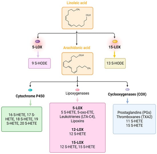 Transformations of selected fatty acid derivatives. Linoleic acid is metabolized by 5-LOX to 9-HODE, and by 15-LOX to 13-HODE. Arachidonic acid can be metabolized by cytochrome P450 enzymes to HETEs including 20-HETE, by COX enzymes to prostaglandins, and by 5-LOX and 12/15-LOX enzymes to lipoxins, leukotrienes, 5-HETE, 12-HETE, 15-HETE, and 5-oxo-ETE. Created with BioRender.com.