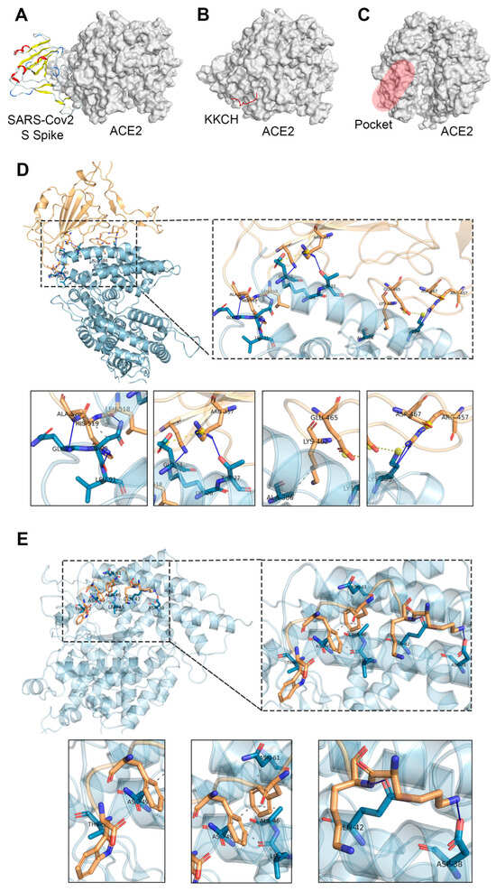 (A) Molecular docking of SARS-CoV-2 S spike protein and ACE2 protein. (B) Molecular docking of KKCH peptide and ACE2 protein. (C) The common binding pocket of KKCH peptides and the SARS-CoV-2 S spike protein. (D) The interaction sites between the SARS-CoV-2 S spike protein and ACE2 protein. (E) The interaction sites between KKCH peptides and ACE2 protein. The blue solid line represents hydrogen bonding, the gray dashed line represents hydrophobic interactions, and the yellow dashed line represents salt bridging.