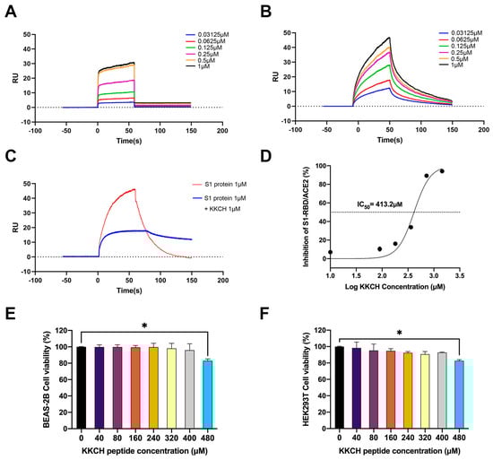 (A) Binding kinetics of KKCH with ACE2 protein measured using SPR. (B) Binding kinetics of SARS-CoV-2 S1 protein with ACE2 protein measured using SPR. (C) KKCH and SARS-CoV-2 S1 protein competition for binding to ACE2 protein measured using SPR. (D) The effect of KKCH on the in vitro binding of S1-RBD protein to ACE2 protein measured using ELISA. (E) CCK8 assay for detecting the effect of KKCH on BEAS-2B cell activity. (F) CCK8 assay for detecting the effect of KKCH on HEK293T cell activity. Statistically significant differences were analyzed using one-way analysis of variance (ANOVA). * p ≤ 0.05 compared with 0 μM.