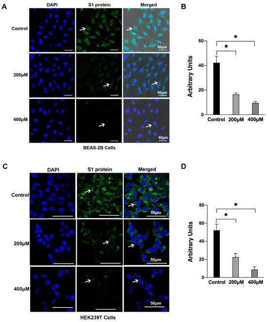 Immunofluorescence detection of the effect of KKCH on the binding of SARS-CoV-2 S1 protein to cells. Cells were treated with 0, 200, and 400 μM KKCH. Single-channel images of S1 protein and DAPI, as well as their overlapping images (merged images), are displayed. Scale bar, 50 μm. The position indicated by the white arrow is the S1 protein. (A) BEAS-2B cells. (B) Statistical results of the mean fluorescence intensity of S1 protein in (A). (C) HEK293T cells. (D) Statistical results of the mean fluorescence intensity of S1 protein in (C). Statistically significant differences were analyzed using one-way analysis of variance (ANOVA). * p ≤ 0.05 compared with control.