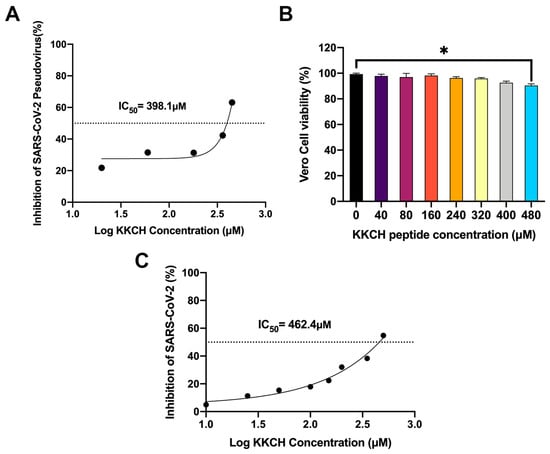 In vitro antiviral activity of KKCH peptide. (A) Inhibition rate of KKCH peptide against SARS-CoV-2 pseudovirus. (B) CCK8 assay for detecting the effect of KKCH on Vero cells. Statistically significant differences were analyzed using one-way analysis of variance (ANOVA). * p ≤ 0.05 compared with 0 μM. (C) Inhibition rate of KKCH peptide against SARS-CoV-2.