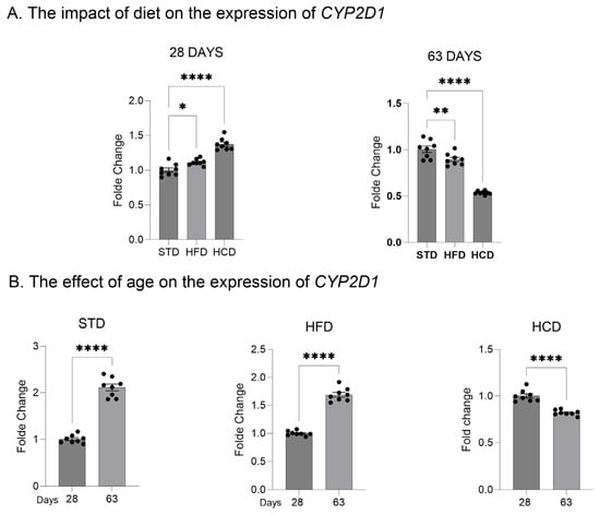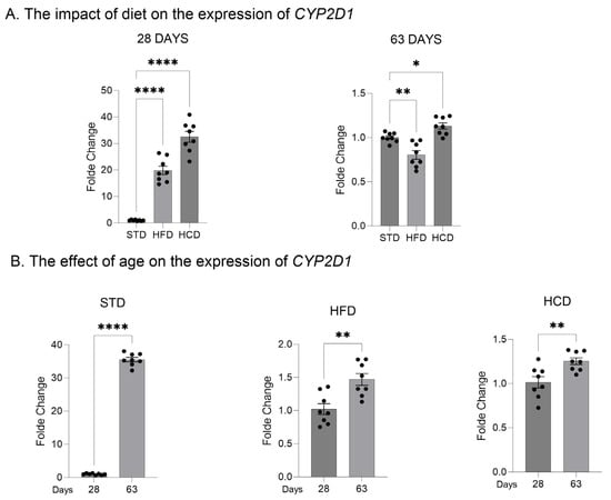 The effect of maternal high-fat diet (HFD) or high-carbohydrate diet (HCD) during pregnancy and lactation on the CYP2D1 mRNA level in the liver of male rat offspring at postnatal days 28 and 63. The data are expressed as the mean ± S.E.M (n = 8). (A) The results were evaluated statistically using a one-way analysis of variance (ANOVA) followed by Dunnett’s multiple comparison test. (B) The results were analyzed using the unpaired Student’s t-test. Statistical significance is shown as * p < 0.05, ** p < 0.01; **** p < 0.0001. STD—male offspring from mothers on standard diet (control group); HFD—male offspring from mothers on high-fat diet; HCD—male offspring from mothers on high-carbohydrate diet.