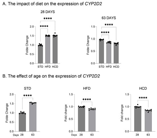 The effect of maternal high-fat diet (HFD) or high-carbohydrate diet (HCD) during pregnancy and lactation on the CYP2D2 mRNA level in the liver of male rat offspring at postnatal days 28 and 63. The data are expressed as the mean ± S.E.M. (n = 8). (A) The results were evaluated statistically using a one-way analysis of variance (ANOVA) followed by Dunnett’s multiple comparison test. (B) The results were analyzed using the unpaired Student’s t-test. Statistical significance is shown as **** p < 0.0001. STD—male offspring from mothers on standard diet (control group); HFD—male offspring from mothers on high-fat diet; HCD—male offspring from mothers on high-carbohydrate diet.
