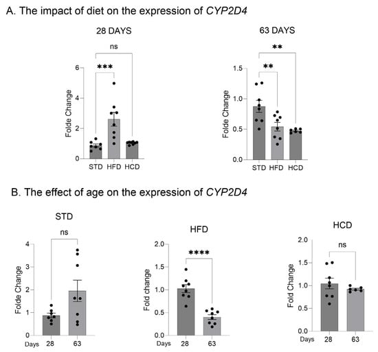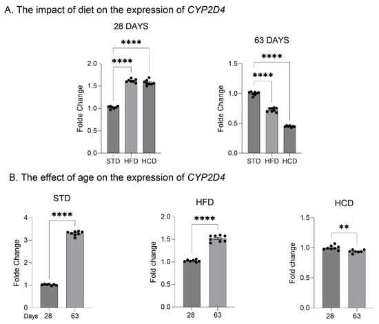The effect of maternal high-fat diet (HFD) or high-carbohydrate diet (HCD) during pregnancy and lactation on the CYP2D4 mRNA level in the liver of male rat offspring at postnatal days 28 and 63. The data are expressed as the mean ± S.E.M (n = 8). (A) The results were evaluated statistically using a one-way analysis of variance (ANOVA) followed by Dunnett’s multiple comparison test. (B) The results were analyzed using the unpaired Student’s t-test. Statistical significance is shown as ** p < 0.01; **** p < 0.0001. STD—male offspring from mothers on standard diet (control group); HFD—male offspring from mothers on high-fat diet; HCD—male offspring from mothers on high-carbohydrate diet.