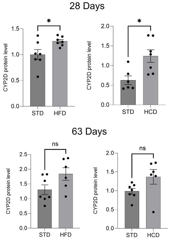 The effect of maternal high-fat diet (HFD) or high-carbohydrate diet (HCD) during pregnancy and lactation on the CYP2D protein level in the liver of male rat offspring at postnatal days 28 and 63. All values are the mean ± SEM of 6–7 animals. The results were evaluated statistically using the unpaired Student’s t-test of independent samples. Statistical significance is shown as * p < 0.05, ns—not significant. STD—male offspring from mothers on standard diet (control group); HFD—male offspring from mothers on high-fat diet; HCD—male offspring from mothers on high-carbohydrate diet. The original Western blot membranes are shown in Supplementary Materials (Figure S1).
