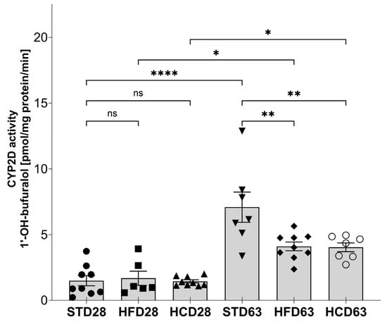 The effect of maternal high-fat diet (HFD) or high-carbohydrate diet (HCD) during pregnancy and lactation on the CYP2D activity in the liver of male rat offspring at postnatal days 28 and 63. The CYP2D activity was determined in liver microsomes using the CYP2D specific reaction, i.e., 1′-hydroxylation of bufuralol. The data are expressed as the mean ± S.E.M (n = 7–9). The results were evaluated statistically using a two-way analysis of variance (ANOVA) followed by Tukey’s multiple comparison test. Statistical significance is shown as * p < 0.05; ** p < 0.01; **** p < 0.0001, ns—not significant. STD28—male offspring from mothers on standard diet at postnatal day 28 (control group); HFD28—male offspring from mothers on high-fat diet at postnatal day 28; HCD28—male offspring from mothers on high-carbohydrate diet at postnatal day 28; STD63—male offspring from mothers on standard diet at postnatal day 63 (control group); HFD63—male offspring from mothers on high-fat diet at postnatal day 63; HCD63—male offspring from mothers on high-carbohydrate diet at postnatal day 63.