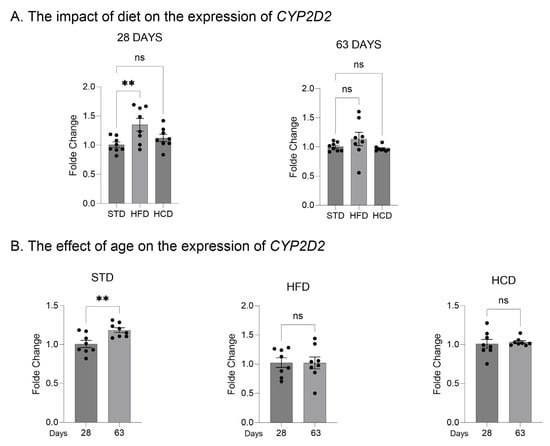 The effect of maternal high-fat diet (HFD) or high-carbohydrate diet (HCD) during pregnancy and lactation on the CYP2D2 mRNA level in the prefrontal cortex of male rat offspring at postnatal days 28 and 63. The data are expressed as the mean ± S.E.M (n = 8). (A) The results were evaluated statistically using a one-way analysis of variance (ANOVA) followed by Dunnett’s multiple comparison test. (B) The results were analyzed using the unpaired Student’s t-test. Statistical significance is shown as ** p < 0.01, ns—not significant. STD—male offspring from mothers on standard diet (control group); HFD—male offspring from mothers on high-fat diet; HCD—male offspring from mothers on high-carbohydrate diet.