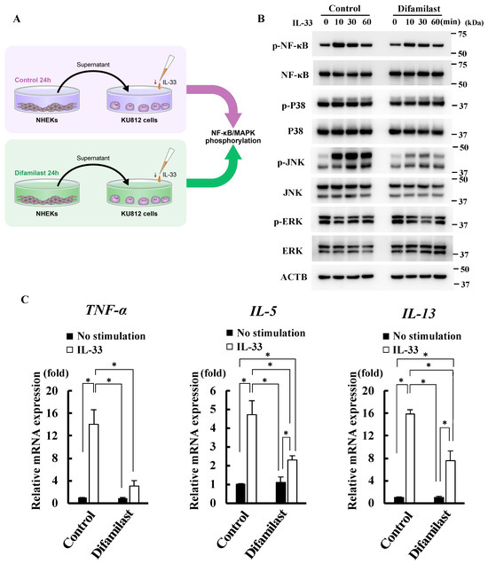 NHEKs cultured in epidermal growth factor- and hydrocortisone-free medium were incubated with either 5 μM difamilast or vehicle control (DMSO) for 24 h. KU812 cells were stimulated with the supernatant and IL-33 (10 ng/mL) for the indicated times (Figure 2A).