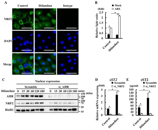 Difamilast treatment produced sST2 via the AHR–NRF2 axis in NHEKs. (A) Immunohistochemical analysis. NHEKs were treated with 5 μM difamilast or control for 24 h. NRF2 (green) expression is shown with nuclear staining (blue, DAPI). Bar = 50 μm. Images are representative of three independent experiments. (B) NHEKs were transfected with ARE-luciferase vector and treated with 5 μM difamilast or control for 3 h. Luciferase activity is shown as fold change, with that of mock-transfected control-treated cells as 1. Data are expressed as mean ± S.D.; N = 3/group. * p < 0.05; Tukey’s multiple comparison test. (C) Western blot analysis of nuclear expression of AHR and NRF2. NHEKs transfected with scrambled siRNA (Scramble) or AHR siRNA (si_AHR) were treated with 5 μM difamilast for 15, 30, 60, 120, or 180 min. Nuclear proteins were extracted. Representative images from three separate experiments are shown. (D,E) NHEKs were transfected with scrambled siRNA (Scramble) or siRNA against NRF2 (si_NRF2) and then treated with difamilast (5 μM) for 24 h. (D) qRT-PCR. (E) ELISA on supernatant. (D,E) Data are expressed as mean ± S.D.; N = 3/group. * p < 0.05; Tukey’s multiple comparison test.
