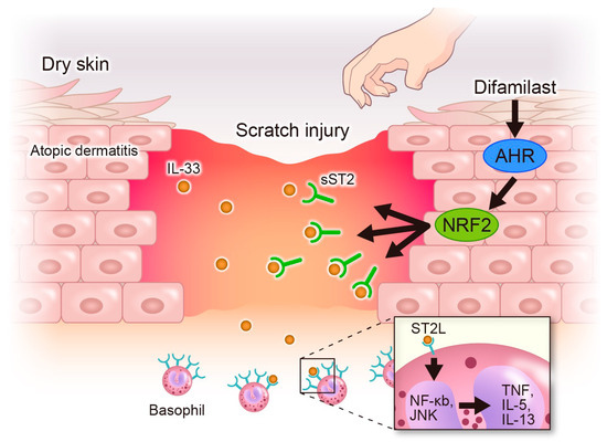 Difamilast treatment produces sST2 via the AHR–NRF2 axis, which inhibits IL-33-induced basophil activation. IL-33, a pruritic cytokine, is highly expressed in keratinocytes of AD and dry skin. IL-33 is secreted into the extracellular space via cell death such as necrosis induced by scratch injury. Secreted IL-33 activates basophils via ST2L binding and phosphorylation of NF-κB and JNK, leading to the upregulation of TNF-α, IL-5, and IL-13. Topical difamilast treatment produces sST2 via the AHR–NRF2 axis in keratinocytes. The sST2 blocks IL-33 binding to the ST2L receptor, resulting in inhibition of basophil activation.