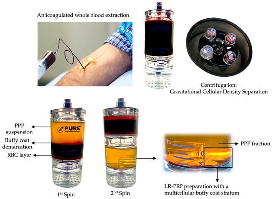 Portrayal of a 2-spin centrifugation method used to produce autologous PRP. PRP preparation involves the collection of a predetermined volume of peripheral blood in collection syringes containing an anticoagulant, like calcium citrate 3.8%. The predonated whole blood is gently loaded in a PRP device for gravitational cellular density separation using a two-spin centrifugation protocol. After the first spin cycle, the whole blood components are separated into three basic layers: the PPP suspension, the buffy coat demarcation layer, and the RBC layer. During the second centrifugation cycle, the platelet and other cells in the PPP fraction and RBC layer are further separated, resulting in a multicellular buffy coat stratum containing high concentrations of platelets and, eventually, leukocytes. A calculated portion of the PPP fraction is removed, leaving the platelet concentrate within a small volume of plasma for platelet resuspension. Thereafter, the PRP is extracted from the device. In this graphic, LR-PRP has been prepared, and the multicellular fractions consist of a high concentration of platelets, monocytes, lymphocytes, neutrophils, and some red blood cells. Abbreviations: PPP: platelet-poor plasma; RBC: red blood cells; LR-PRP: leukocyte-rich PRP; PRP: platelet-rich plasma.