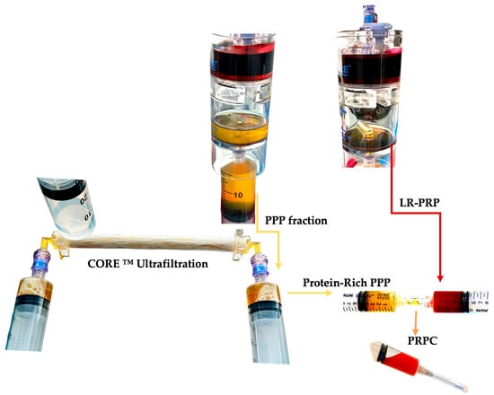 PR-PRP is a liquid autologous product derived from a unit of whole blood following PRP processing. Typically, the PPP fractions are discarded after PRP processing; however, when preparing PR-PRP, the PPP fraction is processed with a concentrating device. A new generation biocompatible ultrafiltration device has been developed to concentrate the PPP proteins by processing this volume through hollow fiber semipermeable ultrafiltration [193]. By reducing plasma water in a controlled manner, a volume of PPP plasma proteins with a molecular weight larger than the ultrafiltrate membrane pore size is concentrated, along with several important extra-platelet growth factors, to a low-volume, viscous, protein-rich plasma product [194].