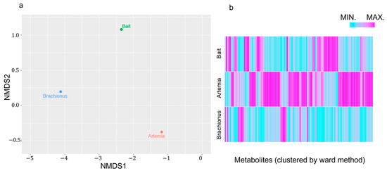 We farmed P. leopardus in a single tank and fed them three types of food, brachionus, artemia, and artificial bait. Based on the facility’s experience, the food type ingested depends on the physical size of the oral cavity. Therefore, we assumed that the fish ate brachionus in the early stage of farming and artemia in the following stage. We measured the differences in the components of these feed types using NMR spectroscopy and calculated the Euclidean distance and the similarity of individual spectra (Figure 1). In Figure 1a, calculated distance data are shown on a Nonmetric Multidimensional Scaling map, indicating that each feed had different components. In Figure 1b, scaling and clustering were performed for each feed component to show the similarity between each feed type, indicating that each contained characteristic components.