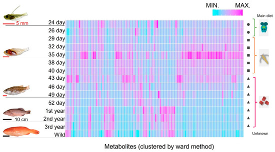 Figure 2. Heatmap of the components in the muscles of P. leopardus sorted by time (days) after hatching. Fish are arranged in descending order from top to bottom, with natural ocean fish at the bottom. Left, number of days since hatching; right, main feed type. Circles, squares, and triangles indicate brachionus, artemia, and artificial bait, respectively. The graph is sorted by metabolite similarity (Ward method, arranged by similarity). A normalization step was performed for each metabolite.