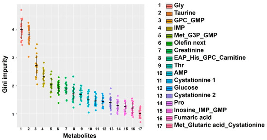 Individual size variation emerged early. At the final sampling point, 52 days after hatching, mean length differed by 61% and mean weight differed by 350% between the high-growth and low-growth groups. A Shapiro–Wilk test for a Gaussian distribution did not deny the Gaussian distribution in the early days; however, the p value gradually decreased over time, reaching p = 0.0033 at 52 days, deviating from the Gaussian distribution. Under our farming conditions, each feed type had characteristic components, and the main feed also changed over time. Although the muscle components changed at each stage, we used machine learning methods to explore whether there were universally important factors affecting body size when classifying the high-growth and low-growth groups. We used a random forest approach, which is a machine learning method that uses decision trees for classification. Random forests are fast to calculate, even for big data, and they are highly accurate. However, this method is not suitable for unsupervised data. Since the Gini impurity, which is an index of importance calculated by the random forest, changes slightly with each calculation, we averaged 20 calculations (Figure 3). The figure shows components with an average Gini impurity of >1. Although many components had a value <3, there were two components that had a value close to 4: glycine and taurine.