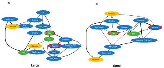 Figure 4. Probabilistic network for large and small fish based on important growth factors. Components that were used were extracted from random forest regression and from those that suggested a relationship between taurine and glycine. Part (a) was drawn using Large sample data (largest five individuals on each sampling day), and part (b) was drawn using Small sample data (smallest five individuals on each sampling day). The arrows indicate the probabilistic direction, and the line width indicates the strength of the connection. Red borders indicate important factors for growth (objective variables for regression), green indicates amino acids, yellow indicates glucose and blue indicates other components.