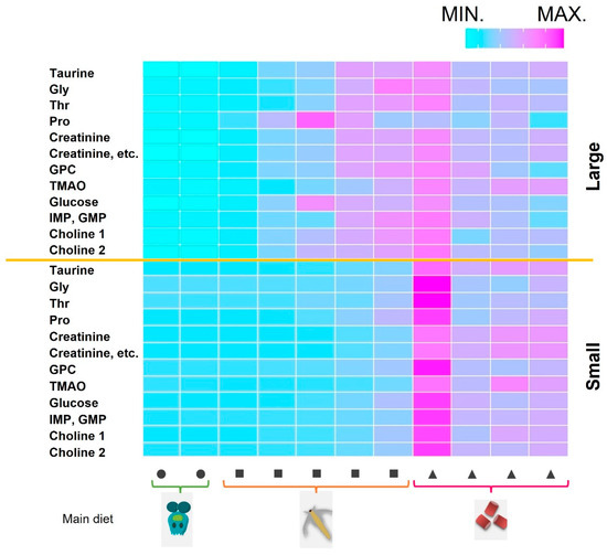 We set glycine and taurine as objective variables and performed random forest regression to identify components or metabolic networks related to glycine and taurine within each group. Furthermore, by conducting Bayesian network analysis using the extracted constituent factors, we estimated components that influence glycine and taurine (Figure 4). Bayesian network analysis suggested a relationship between glycine, threonine, and proline in the Large group, and a relationship between taurine and creatine in both groups. Furthermore, since two signals derived from glucose were embedded in the network, implying that the factors belonging to this module were equivalent to glucose, we inferred that the module was closely related to glucose utilization. Indeed, taurine is suggested to be related to glucose metabolism [36]. To investigate at which stage of early farming these factors were important, we created a heatmap in which each component was scaled over time (Figure 5). In the Small group, there was little fluctuation after reaching a peak the day we switched to artificial bait. Conversely, in the Large group, proline and glucose reached peaks when artemia was the main diet, and other components tended to be higher during that period. Thus, an intake of growth-related components such as glucose and proline when artemia was the main diet impacted later growth. The third sampling when artemia was the main diet was 35 days after hatching, and it was suggested that the transfer of glucose and required amino acids to the muscles before then might influence body size 43 days after hatching, when artificial bait was switched. This result is reasonable as proline and glycine are important for collagen synthesis [32].