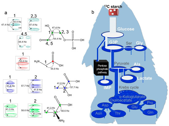 Figure 6. 1H–13C HSQC spectra of water-soluble metabolites in P. leopardus muscle tissue. (a) Coupling constants between carbon atoms shown in Hz and indicated by arrows. Carbon atoms of the amino acids are successively numbered from the carboxyl carbon next to those carrying the amino group. Colored signals are 13C-labeled metabolites derived from 13C-labeled starch in the feed. Green, glyceraldehyde-3-phosphate (G3P); red, glycine; blue, lactate; light green, alanine. (b) Illustration of the metabolism of 13C-labeled starch into other compounds based on visual inspection of NMR data.