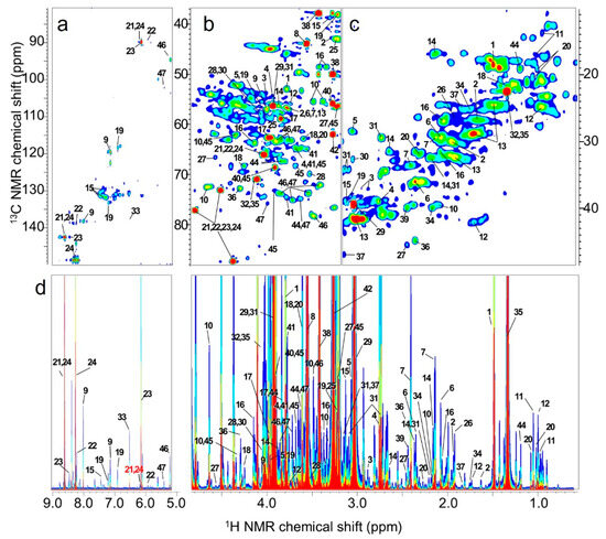 42. Chikayama, E.; Sekiyama, Y.; Okamoto, M.; Nakanishi, Y.; Tsuboi, Y.; Akiyama, K.; Saito, K.; Shinozaki, K.; Kikuchi, J. Statistical indices for simultaneous large-scale metabolite detections for a single NMR spectrum. Anal. Chem. 2010, 82, 1653–1658. [Google Scholar] [CrossRef] [PubMed]