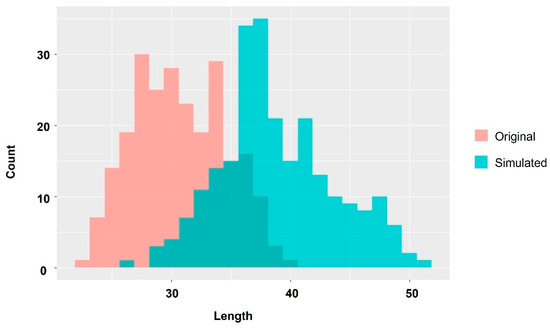 Figure 8. Histogram showing original growth distribution of P. leopardus and simulation results of aquaculture using starch effectively. Red histogram indicates length of P. leopardus at 52 days after hatching, and blue histogram indicates the simulated result. The simulation was scaled such that the average improvement was 30% and deviation was 10%.