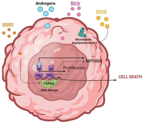 A simple summary of the molecular action mechanisms of doxorubicin (DOXO), docetaxel (DOCE), and bicalutamide (BICA) is represented. Continuous arrows indicate molecular binding or action, while dashed arrows indicate blocking action. The androgen receptor is represented as AR, the androgen response elements as AREs, and topoisomerase II-A as TOPIIA.