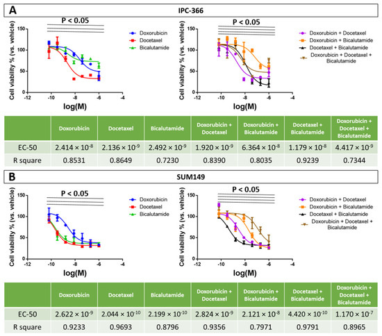 Sensitivity assay results of doxorubicin, docetaxel, bicalutamide, and their combinations in IPC-366 cell line (A) and SUM149 cell line (B). Results are expressed graphically with cell viability percentage as a function of the molarity logarithm (Log (M)) of each drug. EC-50 values and R-square of each drug are summarized in the tables below. p < 0.05 denotes significant differences between doses.
