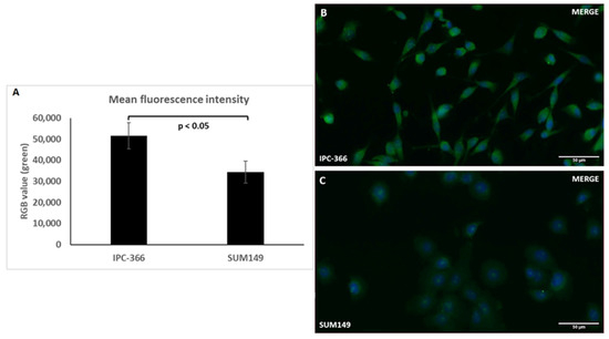 SUM149 and IPC-366 cells showed AR expression by immunofluorescence but differed in the intensity of the expression. After performing fluorescence quantification with ImageJ software 1.53e version, the results confirmed significant differences (p < 0.001) in AR expression between IPC-366 and SUM149, with higher expression in IPC-366 (Figure 3A). Cytoplasmic and nuclear expression could be observed in IPC-366 (Figure 3B); however, in SUM149, the expression, although very light, is mostly found in the nucleus (Figure 3C).