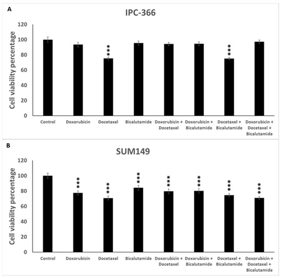 Cell viability assay of IPC-366 (A) and SUM149 (B) cultured cells. Bars represent the cell viability reduction produced by doxorubicin, docetaxel, bicalutamide, and their combinations. *** Denoted p < 0.001 significant differences between control and treatments.
