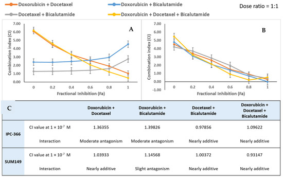 Combination index (CI) versus fractional effect (Fa) curve as described by Chou and Talalay model [41] on IPC-366 (A) and SUM149 (B) cells exposed to doxorubicin plus docetaxel, doxorubicin plus bicalutamide, docetaxel plus bicalutamide, and doxorubicin plus docetaxel plus bicalutamide (1:1). Each point represents the CI ± SD at a fractional effect as determined in our experiments. The line (CI = 1) indicates additivity, the area under this line, synergism, and the area above the line, antagonism. The table represents the CI value at the dose used in in vitro assays and the pharmacological interaction described by Chou and Talalay [42] (C).