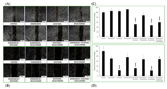 The addition of treatments in both cell lines resulted in differences in migration capacity, especially when combinations of treatments were administered (Figure 6A,B). In general, both cell lines reduced their cell migratory capacity with the combination of treatments more than when the treatments were applied as a single agent, with the exception of docetaxel in SUM149, which migrated 76.85% less than the control after 24 h (Figure 6D). The most effective treatment for reducing cell migration was docetaxel combined with bicalutamide in both IPC-366 and SUM149, which migrated 52.47% and 83.37% less than the control, respectively (Figure 6C,D). In contrast, bicalutamide was the least effective treatment in decreasing cell migration, especially in IPC-366, where it closed 10% of the wound more than the control.