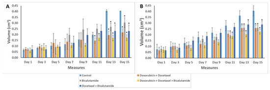 A suspension of 106 IPC-366 cells or 3 × 106 SUM149 cells diluted in PBS was inoculated in the mammary fat pad of 6-8-week-old female Balb/SCID mice with a 21-gauge syringe. The mice were inspected twice weekly for the development of tumors until a volume of 0.5 cm3 was reached. Then, mice were divided into five experimental groups per cell line: a control group (n = 5 mice per cell line) injected with saline solution, and four experimental groups (n = 5 mice per group and cell line) treated with bicalutamide isolated; doxorubicin and docetaxel; docetaxel and bicalutamide; and doxorubicin, docetaxel and bicalutamide, as was described in Section 2.2. Tumors were measured every other day with a caliper, and tumor volume was calculated by volume = ((length) × (width)2)/2 [62].