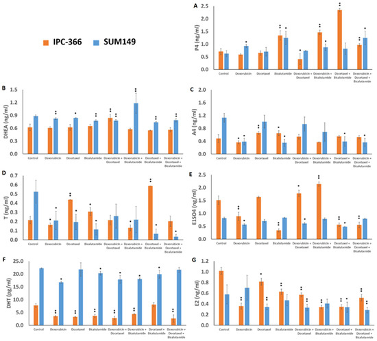 All treatments produced a steroid-hormone alteration with respect to the control, either in in vitro or in in vivo assays. Culture media hormonal results revealed that both cell lines had different hormonal concentrations as the SUM149 control group showed higher androgen levels (DHEA, A4, T, DHT) than the IPC-366 control group, which revealed higher estrogen levels (E1SO4 and E2) (Figure 8). In vitro studies have demonstrated that SUM149 will use androgen levels to maintain estrogen levels similar to control and promote cell survival. Furthermore, it has been observed that a reduction in androgen and E1SO4 levels is associated with a significant decrease in cell viability and migration of SUM149. Conversely, IPC-366 has been shown to significantly reduce cell viability and migration when DHT levels decrease. The hormonal fluctuations observed in vitro are detailed below.