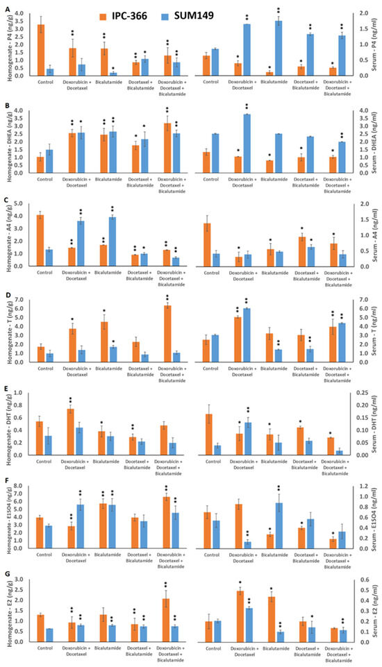 Graphs represent the hormone concentration obtained from serum samples (right panel) and tumor homogenate (left panel) with each single treatment and their combinations. Bars represent means ± SD. (A) P4, (B) DHEA, (C) A4, (D) T, (E) DHT, (F) E1SO4, and (G) E2 levels were determined. * Denoted p < 0.05, and ** p < 0.01 significant differences between control and treatments.
