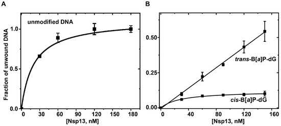 Analyses of the B[a]P DNA adducts’ duplex unwinding curves reveal that the kobs values of the trans and cis adducts are (1.60 ± 0.02) × 10−3 s−1 and (1.47 ± 0.02) × 10−3 s−1, respectively (Figure 5). These values represent significant reductions of ~14-to-15-fold relative to the unmodified DNA with a kobs value of (21.9 ± 0.03) × 10−3 s−1 at the same Nsp13 and DNA concentrations.