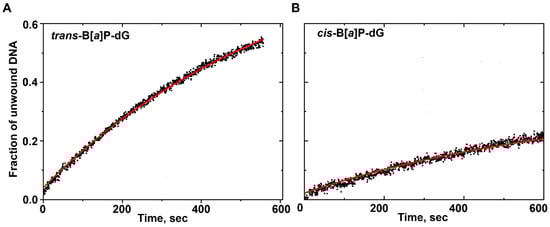 DNA unwinding curves for (A) trans-B[a]P-dG and (B) cis-B[a]P-dG adducts. The curve in red represents the best fit of Equation (1) to the experimental data points (black dots).