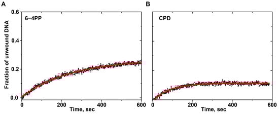 DNA unwinding curves for (A) 6–4PP and (B) CPD lesions. The curve in red represents the best fit of Equation (1) to the experimental data points (black dots).