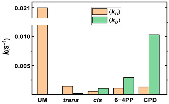 These strong reductions in P values are due not only to the reduction in the unwinding rate constant kU but also to a strong enhancement of the dissociation rate constant kD. An NMR study indicates that Watson–Crick base pairings are absent at the 6–4PP lesion site and at the adjacent base pair on its 3’-side, and the duplex is bent by ~44°, which is likely to destabilize the local double-stranded DNA structure. By contrast, the Watson–Crick pairing at the CPD lesion site is more or less maintained, with a much smaller bend in the duplex of only ~9° [30,31]. Although these structural features revealed that the 6–4PP lesion is more distorting than the CPD, their unwinding rate constants kU are very similar, within experimental error (Figure 7). Thus, the key kinetic parameter governing the processivity is the dissociation rate constant kD, which, in the case of the CPD–duplex, is much greater than it is in the case of the 6–4PP–duplex.